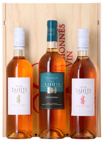 Coffret Bois 3 Vins de Tahiti : 1 Blanc sec + 1 blanc moelleux + 1 Rosé